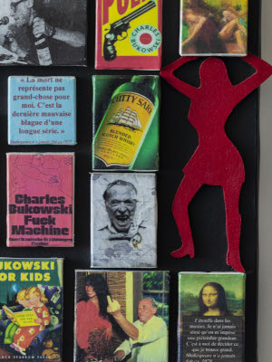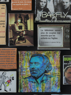 Ce tableau est entièrement recouvert de mini-châssis collés : photos de Bukowski, couvertures de livres, et nombreuses citations.