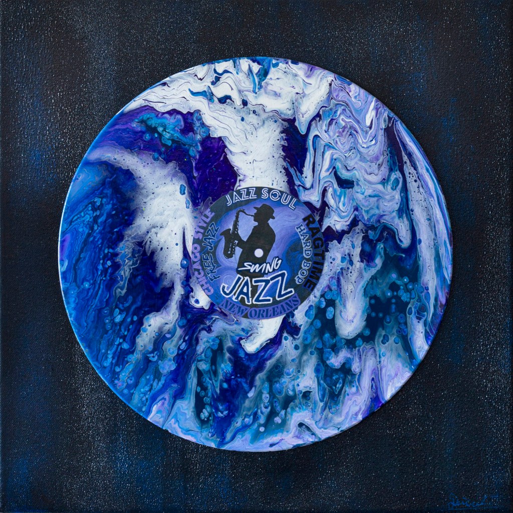 Au centre de ce véritable disque vinyle, un collage, illustrant l’esprit du Jazz, en y mentionnant les différents sous-genres.