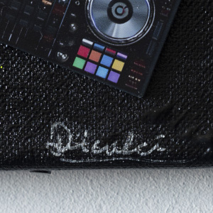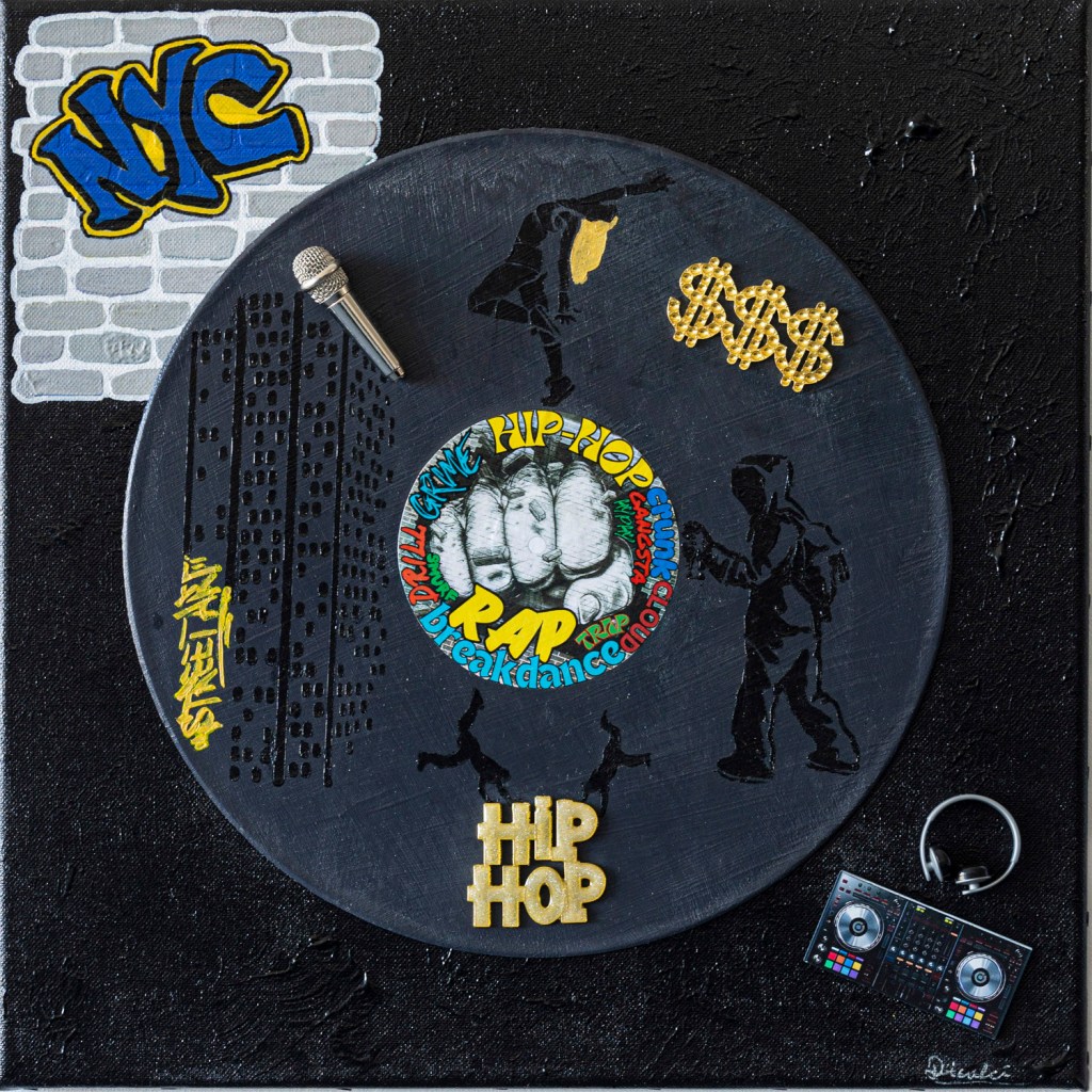 Véritable disque vinyle vintage collé sur une toile de 40×40 cm, peinte à l’acrylique. Un graffiti en haut à gauche sur un vieux mur de briques, ainsi qu’une table de mixage et un casque de musique, viennent terminer cette toile.