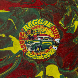 En son centre, un collage, illustrant l’esprit du Reggae, en y mentionnant les différents sous-genres.