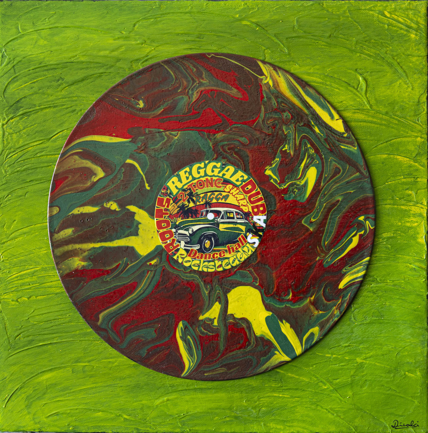 Disque collé sur une toile de 40×40 cm, peinte à l’acrylique.