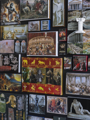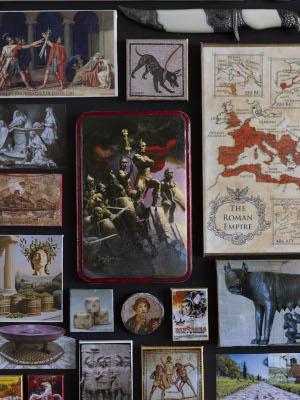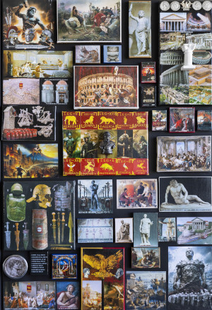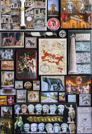Ces nombreux collages illustrent l’histoire de Rome de sa création par Romulus en -753, jusqu’à sa chute en 476.