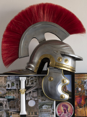 Triptyque de L 180 x H 90 cm posé sur un chevalet de peinture, “escorté” par des reproductions de glaives, dague et casque de centurion.